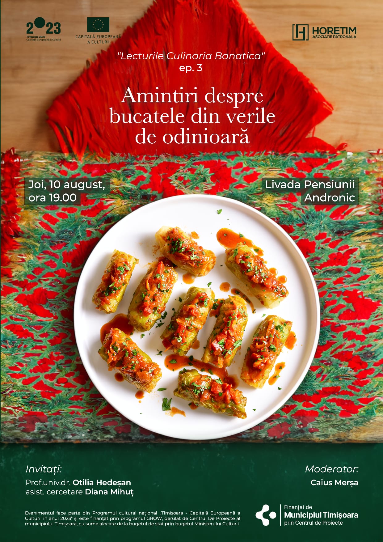 Această ediție, sub tema „Amintiri despre bucatele din verile de odinioară„, va fi onorată de prezența a două invitate de seamă: Diana Mihuț, asistent cercetare în cadrul Departamentului de Studii Românești de la Universitatea de Vest din Timișoara, absolventa aceleiași instituții, a tuturor celor trei cicluri de studii ale învățământului superior, la Facultatea de Litere, Istorie și Teologie, și masterată în specializarea Comunicare Interculturală împreună cu Otilia Hedeșan, director al Centrului de Cercetare pentru Patrimoniu și Antropologie Culturală, Universitatea de Vest din Timișoara.