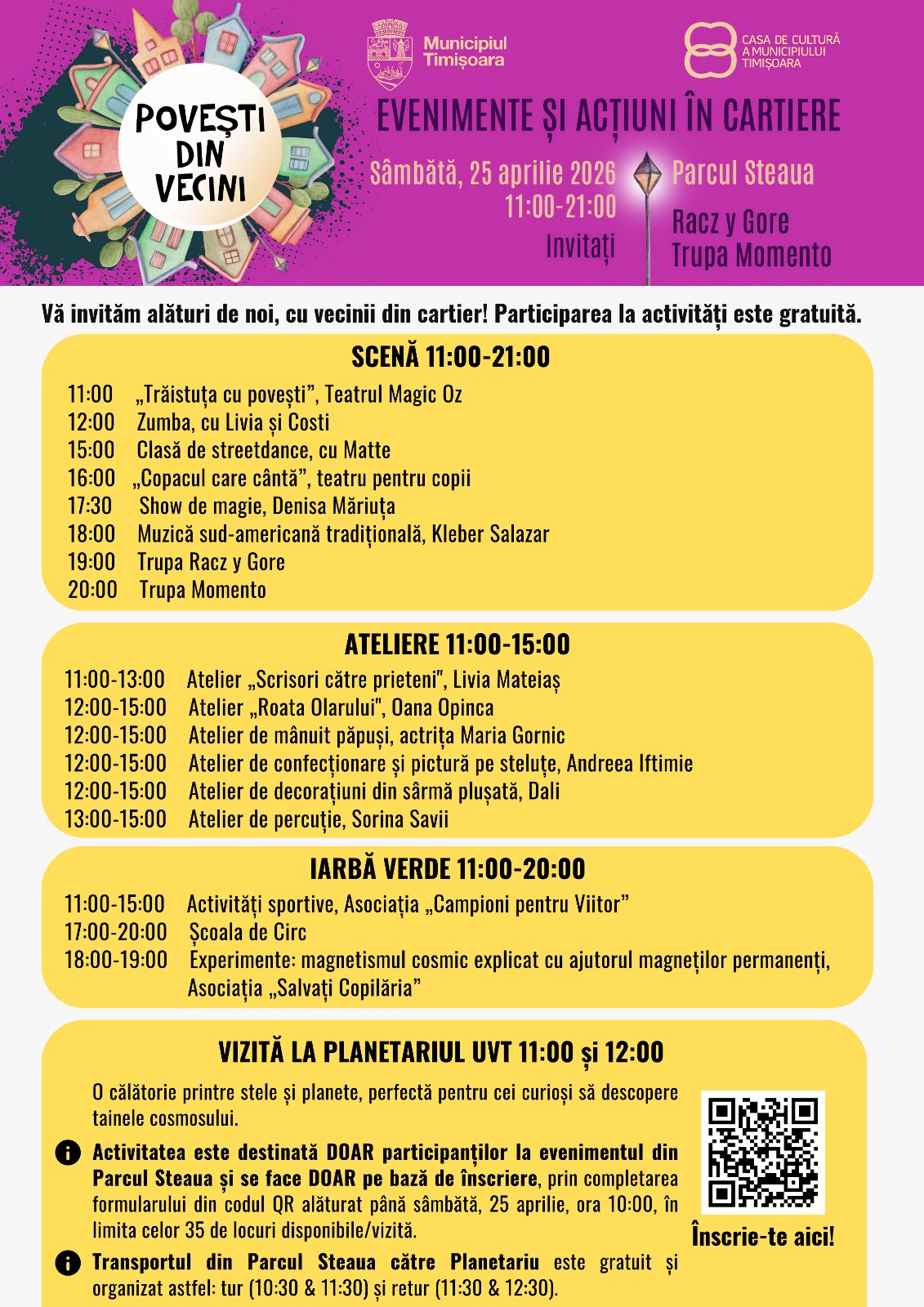 Sâmbătă, 25 aprilie 2026, în Parcul Steaua din Timișoara va avea loc evenimentul „Povești din Vecini – Evenimente și acțiuni în cartiere”, desfășurat între orele 11:00 și 21:00, cu participare gratuită.