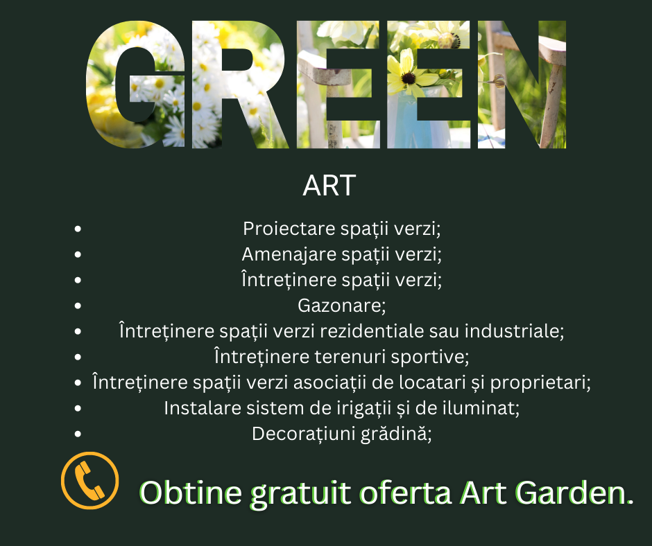 Art Garden se străduiește să ofere un loc special pentru toate ocaziile și să întreacă mereu așteptările. Cu designeri experimentați de grădină la dispoziția dumneavoastră, veți putea transforma orice locație într-o locație încântătoare! Avem o echipă de profesioniști în amenajări grădini care vă va oferi toate serviciile necesare pentru o grădină perfectă. Luati legătura cu noi acum vizitand siteul nostru web www.artgarden.ro sau cu un simplu telefon la număr: +40 746 500 570.