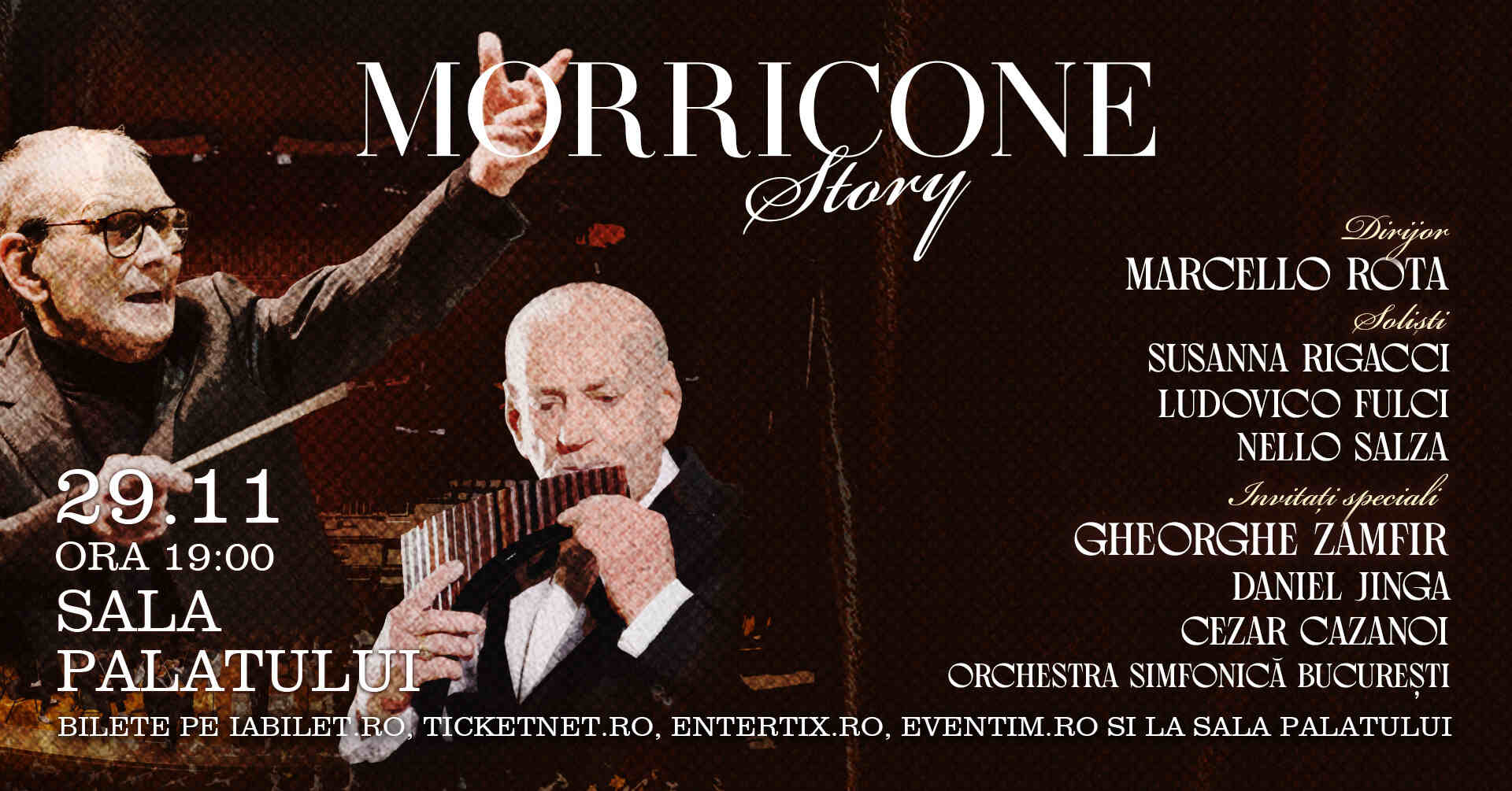 Pe 29 noiembrie, Sala Palatului din București va găzdui în avanpremieră concertul „Morricone Story”, un “spectacol eveniment” în care publicul va asculta compozițiile premiate ale marelui maestru al muzicii de film, Ennio Morricone, cu prezența soliştilor care au făcut istorie împreună cu marele compozitor italian, Nello Salza (trompetă), Ludovico Fulci (pian) și Susanna Rigacci (soprană).