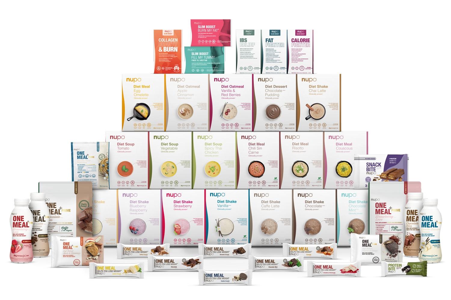 Produsele Nupo sunt împărțite în patru categorii: Dietă, One Meal ( O singură masă ), Gustări Proteice și Slim Boost. Produsele pot fi savurate separat sau pot fi combinate. Produsele Nupo sunt aprobate de EFSA și de toate Ministerele responsabile cu securitatea alimentară în țările în care se comercializează ca aliment înlocuitor complet al dietei.