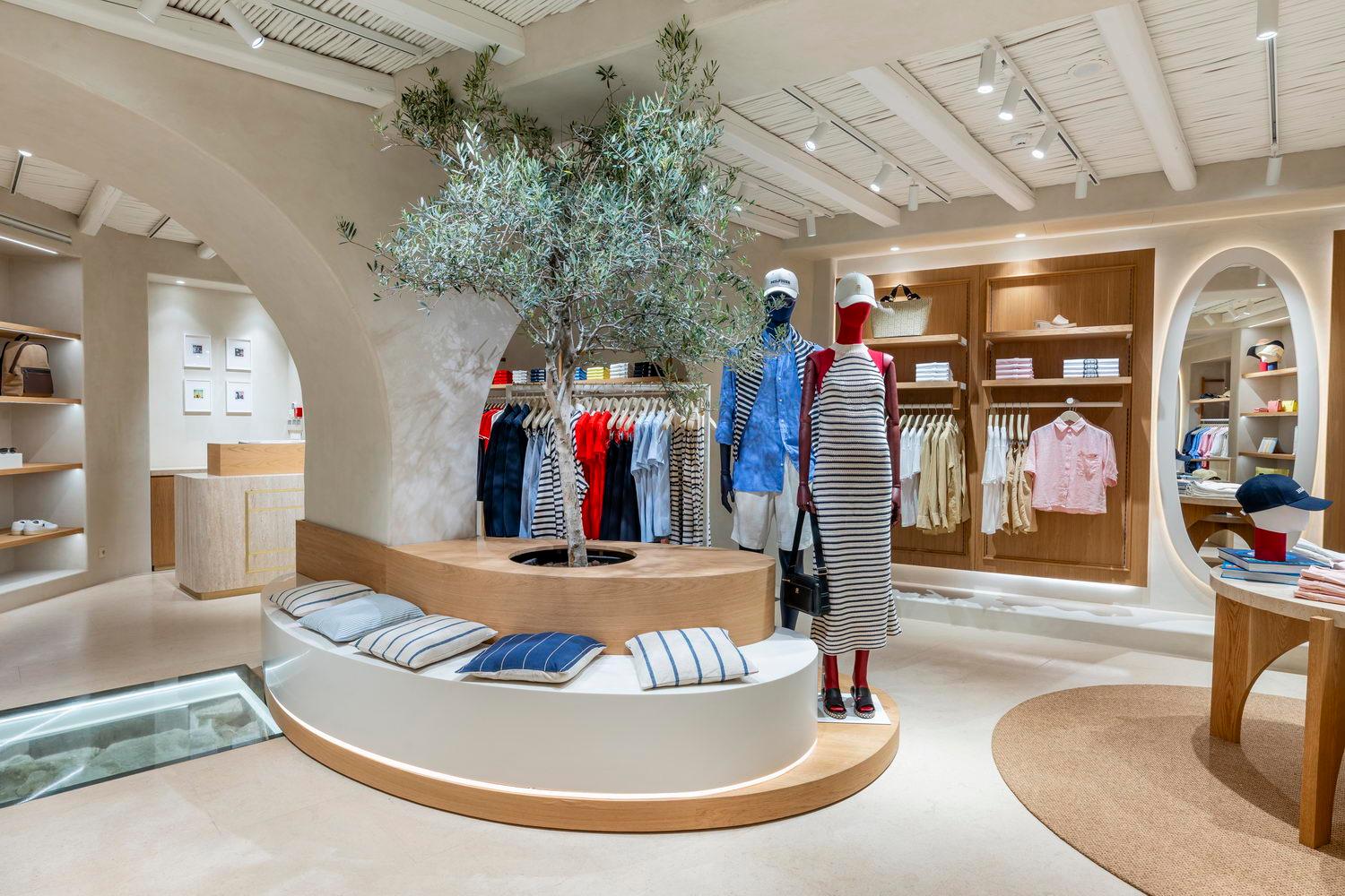 Situat printre clădirile albe tipice din Mykonos, pitorescul magazin este proiectat în conformitate cu estetica insulei. Construit cu tavane din salcie locală și podele din marmură de calcar pentru un aspect fresh, spațiul aduce un omagiu stilului tradițional cicladic. O zonă intimă de relaxare înconjoară un măslin, completată de semnalizarea subtilă a magazinului, care se integrează armonios cu peisajul iconic al insulei Mykonos. În plus, un lounge exterior umbrit invită oaspeții să se relaxeze și să se răcorească în timp ce se bucură de împrejurimile liniștite. Inspirată de ADN-ul brandului în roșu, alb și albastru, magazinul din Mykonos încorporează atitudinea distinctivă Tommy cu o combinație senzuală de clasic și modern.